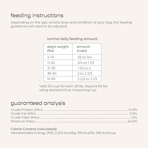 Keep refrigerated. This recipe is fully cooked ready to serve! Store in the refrigerator and use within 7 days of opening. No heating or defrosting required. Feeding Instructions: Depending on the age, activity level, and condition of your dog, the feeding guidelines will need to be adjusted. The normal daily feeding amount for a healthy adult dog: 4-10 lb. dog feed 1/2 – 3/4 cups per day 11-20 lb. dog feed 3/4 – 1 1/3 cups per day 21-35 lb. dog feed 1 1/3 – 2 cups per day 36-50 lb. dog feed 2 – 2 2/3 cups per day 51-65 lb. dog feed 2 2/3 – 3 1/4 cups per day *Add 2/3 cup for each 25 lbs. beyond 65 lbs. Use standard 8 oz measuring cup. These quantities can be fed as one meal or divided into two meals based on your dog's preference. When switching foods, gradually increase the new food and decrease the previous food to help make a smooth transition. Visit your veterinarian regularly to maintain your pet's health. Always provide fresh water.